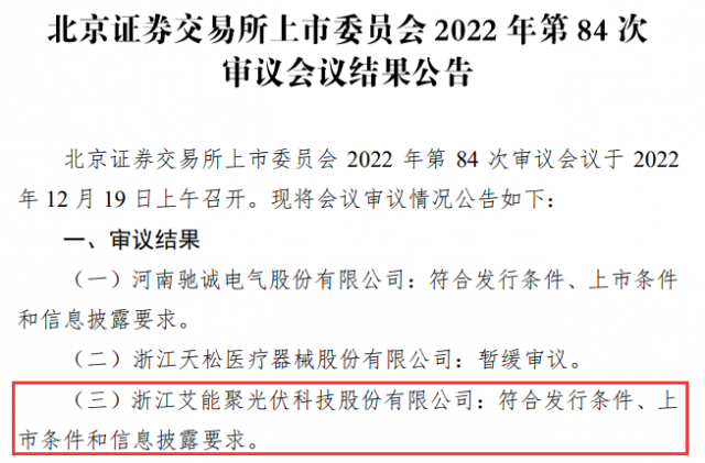 12月19日晚間,北京證券交易所上市委員會(huì)2022年第84次審議會(huì)議結(jié)果出爐,浙江艾能聚光伏科技股份有限公司(簡(jiǎn)稱“艾能聚”)符合發(fā)行條件、上市條件和信息披露要求,成功過會(huì)。