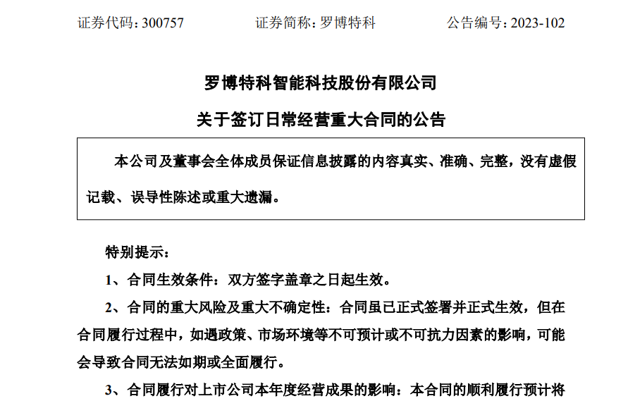 羅博特科表示,合同的簽訂預計將對公司及全資子公司南通羅博本年度及未來年度經營業績產生積極影響,公司及全資子公司南通羅博將根據合同要求以及收入確認原則在相應的會計期間確認收入(最終以經會計師事務所審計的數據為準)。