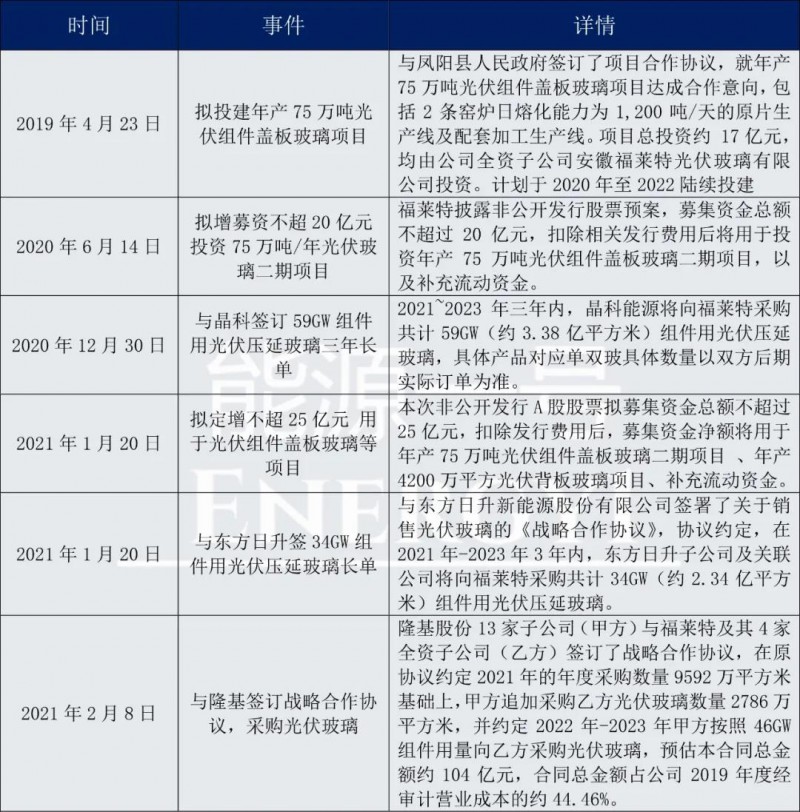 去年12月,它與晶科能源簽訂了59GW的組件用光伏壓延玻璃三年長單;今年1月和2月,福萊特再度分別與東方日升、隆基股份再簽大額長單,預計總計規模在200多億到300億左右。