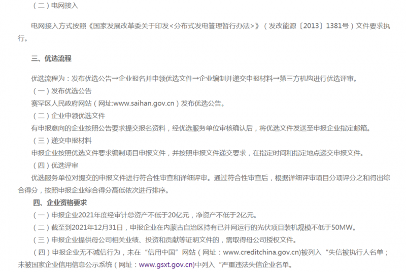 要求申報企業截至到2021年12月31日,在內蒙古自治區持有已并網運行的光伏項目裝機規模不低于50MW。