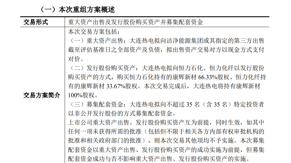 本次分拆完成后,大連熱電將會成為康輝新材的控股股東。其擬通過向康輝新材全體股東發行股份購買其合計持有的康輝新材100%股份,進而實現恒力石化分拆康輝新材重組上市。這在A股還是首次。