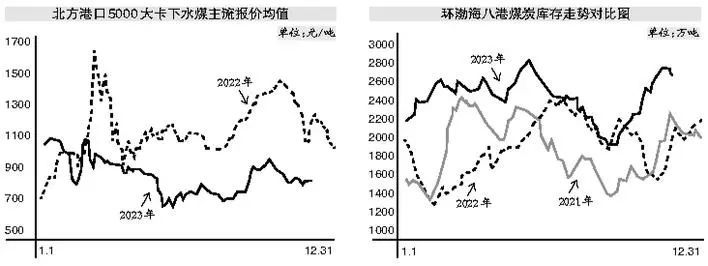 從10月中旬開始,市場煤價格進入一個回落期,下跌趨勢一直延續到11月初。價格回落后,貿易商看漲情緒升溫,詢貨有所增多,加上第一次寒流來襲且水電進入快速回落期,煤炭市場受到一定帶動,價格企穩反彈。隨后在高庫存的壓制下,市場情緒又開始轉弱。進入11月下旬,當港口5000大卡下水煤價格再次回落至每噸800元左右時,供應方出貨意愿降低,疊加第二波寒潮降溫來臨,市場對電廠日耗回升有一定預期,價格小幅反彈。但這波寒潮影響時間較短,后續多地氣溫有所回升,且沿海地區受影響較小,電廠日耗環比增速略有放緩。電廠在高庫存的情況下,對高價接受程度有限,疊加港口高庫存疏港壓力加大,市場煤價格反彈支撐不足,短暫上漲后開始企穩。