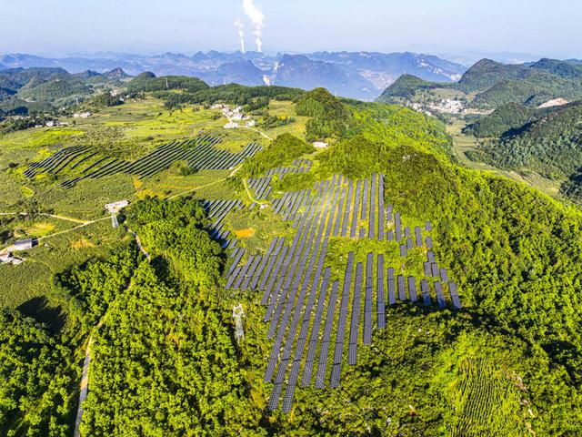 8月14日,黔西市五里布依族苗族鄉石門村,一塊塊藍色光伏板與村莊、道路、青山遙相呼應,共繪出一幅和美鄉村生態畫卷。