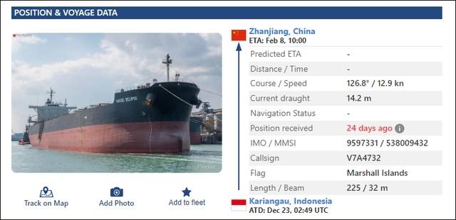 此前船舶數據顯示,裝載澳大利亞煤炭的Magic Eclipse號貨輪駛向湛江港