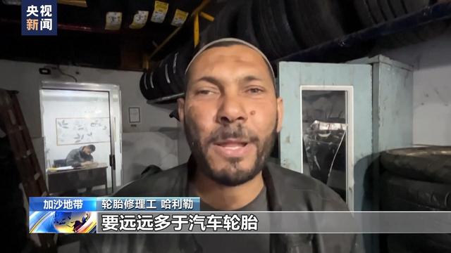 加沙地帶輪胎修理工 哈利勒:我現在修理的馬車或驢車車胎,要遠遠多于汽車輪胎。每天我要修30到50輛馬車或驢車的車胎,但只有四五輛汽車來修輪胎。以軍對我們的圍困令我們十分艱難,戰爭令我們感到絕望,我們每天都在經歷這一切。我們非常缺水,也缺食物,我們無法過正常的生活。