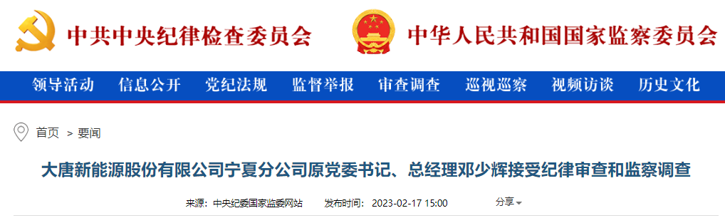中央紀委國家監委網站2月17日消息,據中國大唐集團有限公司紀檢監察組、寧夏回族自治區監察委員會消息:大唐新能源股份有限公司寧夏分公司原黨委書記、總經理鄧少輝涉嫌嚴重違紀違法,目前正接受中國大唐集團有限公司紀檢監察組紀律審查和寧夏回族自治區銀川市監察委員會監察調查。