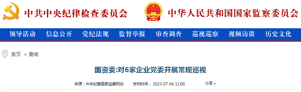中央紀委國家監委網站7月6日消息,經國資委黨委批準,2023年第一輪巡視對中國化學工程集團有限公司、中國鐵路工程集團有限公司、中國鐵道建筑集團有限公司、中國交通建設集團有限公司、中國電力建設集團有限公司、中國能源建設集團有限公司等6家企業黨委開展常規巡視。