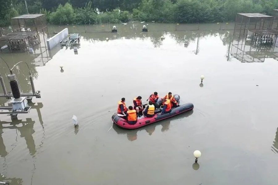 防汛搶險黨員突擊隊隊員乘沖鋒舟進入受損變電站進行勘察