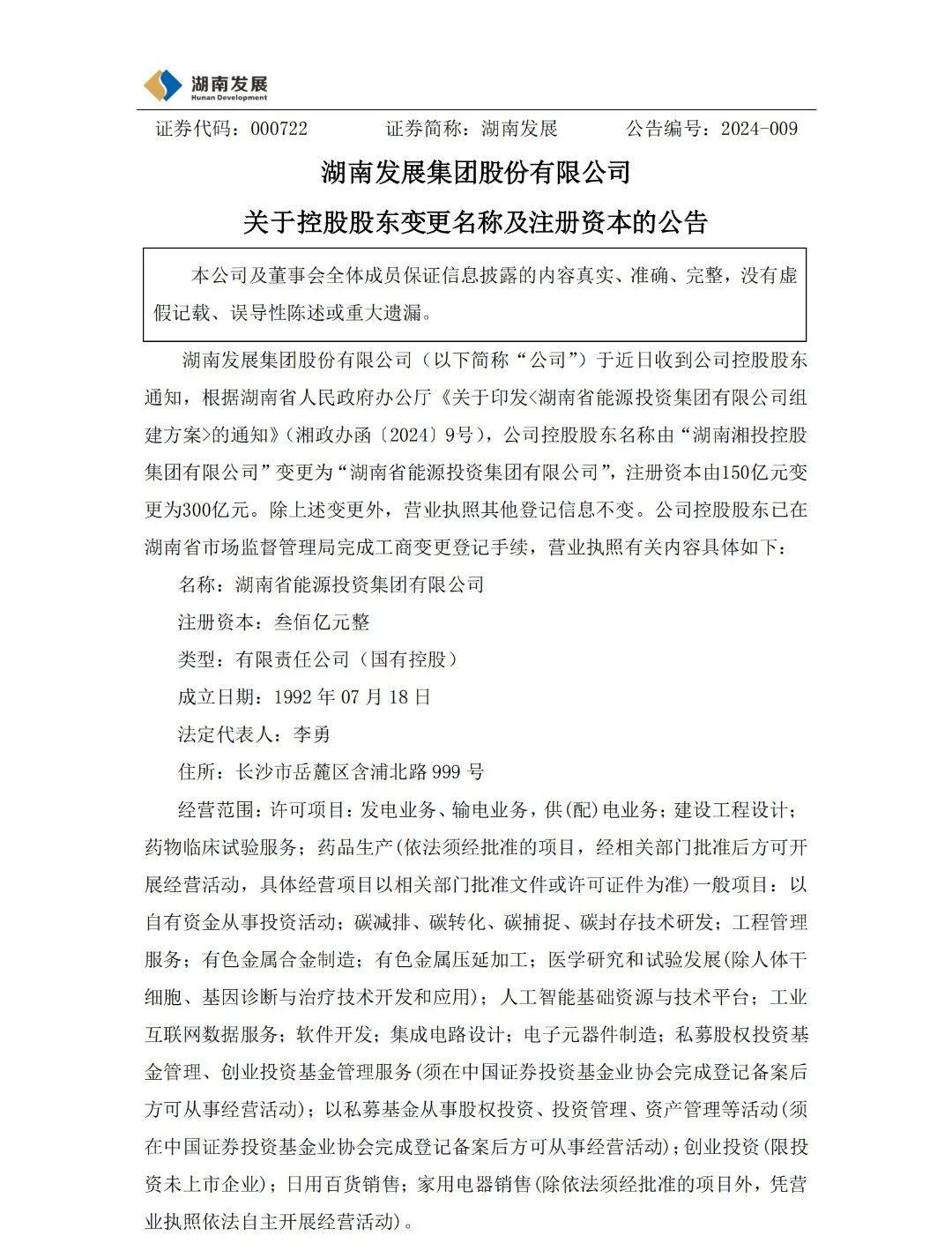 2月27日,湖南發展集團股份有限公司發布關于控股股東變更名稱及注冊資本的公告,公告顯示:湖南發展集團股份有限公司于近日收到公司控股股東通知,根據湖南省人民政府辦公廳《關于印發<湖南省能源投資集團有限公司組建方案>的通知》(湘政辦函〔2024〕9號),公司控股股東名稱由“湖南湘投控股集團有限公司”變更為“湖南省能源投資集團有限公司”,注冊資本由150億元變更為300億元。除上述變更外,營業執照其他登記信息不變。公司控股股東已在湖南省市場監督管理局完成工商變更登記手續。