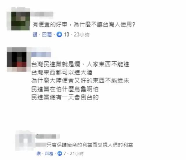 根據(jù)臺灣地區(qū)現(xiàn)行政策,大陸汽車整車、底盤及部分零組件仍被列為“禁入項”。而島內(nèi)民眾對民進黨當(dāng)局的做法并不買賬,相關(guān)報道也引發(fā)網(wǎng)民“吐槽”——“有便宜的好車,為什么不讓臺灣人使用”“民進黨能讓它進來嗎?那豈不是影響了歐美進口車的行情”。更有不少批評聲音指出,島內(nèi)汽車市場在貿(mào)易保護主義作用下簡直是“一潭死水”,創(chuàng)新能力越來越弱。