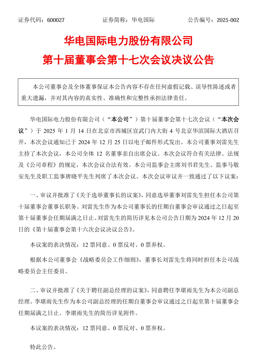 華電國際發布公告稱,公司第十屆董事會第十七次會議于1月14日召開。會議審議并批準了《關于選舉董事長的議案》,同意選舉董事劉雷先生擔任本公司第十屆董事會董事長職務。劉雷先生作為本公司董事長的任期自董事會審議通過之日起至第十屆董事會任期屆滿之日止。
