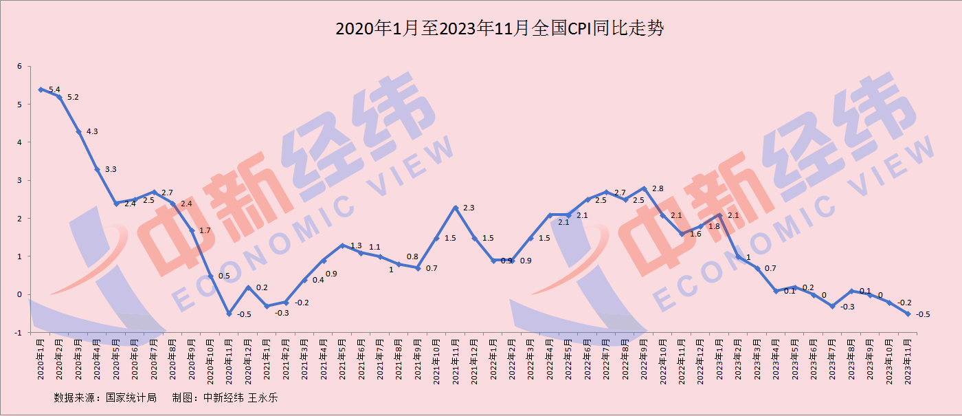 國(guó)家統(tǒng)計(jì)局?jǐn)?shù)據(jù)顯示,2023年11月,全國(guó)CPI環(huán)比下降0.5%,同比下降0.5%。CPI同比連續(xù)兩月處于負(fù)值區(qū)間,且二次探底,創(chuàng)2020年12月以來(lái)最大降幅。