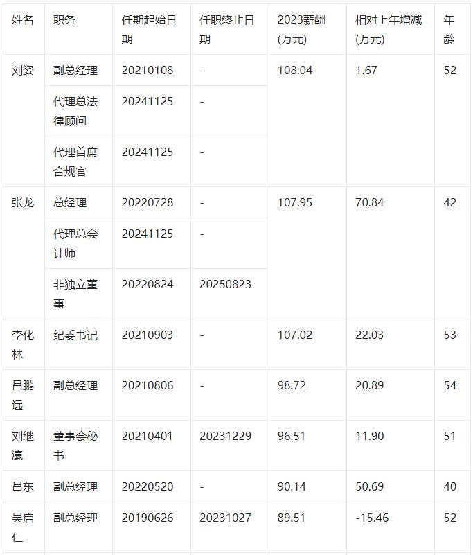 根據2023年報數據,剔除獨立董事、監事會主席、監事后,三峽能源共有13位董事和高級管理人員。從年齡看,三峽能源董事和高級管理人員平均年齡為50.23歲,年齡中位數為52歲,其中,非獨立董事蔡庸忠年齡最高為62歲,副總經理呂東年齡最小為40歲。從薪酬看,董事和高級管理人員合計領取報酬904.35萬元,平均薪酬86.18萬元,年薪中位數為98.72萬元。其中,副總經理、代理總法律顧問及代理首席合規官劉姿薪酬最高為108.04萬元,非獨立董事蔡庸忠薪酬最低為6.00萬元(2023年任期不滿1年的不參與統計)。