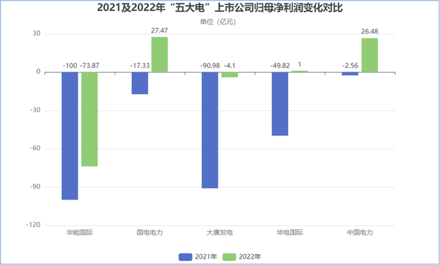 2022年,中國電力歸母凈利潤為26.48億元,2021年為-2.56億元,同比扭虧為盈;國電電力歸母凈利潤為27.47億元,2021年為-17.33億元,同比扭虧為盈;華電國際歸母凈利潤為1億元,2021年為-49.82億元,同比扭虧為盈;大唐發電歸母凈利潤為-4.1億元,2021年為-90.98億元,同比增長95.49%;華能國際歸母凈利潤為-73.87億元,2021年為-100億元,虧損額度有所減少。