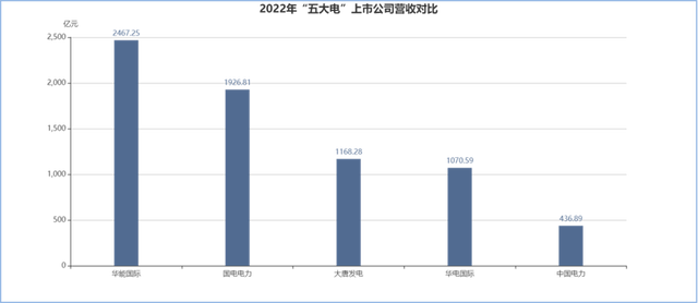 2022年,“五大電”旗下主體發電上市公司營收皆有增長,但座次沒有發生太大變化,華能國際以2467.25億營收依舊領銜。