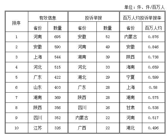 2018年1月,各省(自治區、直轄市)按照有效信息數量排序,河南、安徽、上海等?。ㄊ校┝腥珖?0位;按照投訴舉報數量排序,安徽、河南、湖南等省排在全國前10位;按照百萬人均投訴舉報率排序,內蒙古、安徽、陜西等?。ㄗ灾螀^)位于全國前10位。(2018年1月有效信息及投訴舉報排名前10位情況見表三)