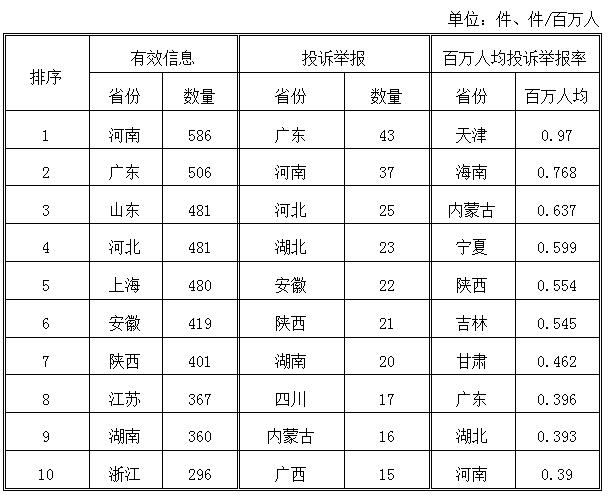 2018年5月,各省(自治區(qū)、直轄市)按照有效信息數(shù)量排序,河南、廣東、山東、河北等省列全國前10位;按照投訴舉報數(shù)量排序,廣東、河南、河北等省排在全國前10位;按照百萬人均投訴舉報率排序,天津、海南、內(nèi)蒙古等?。ㄊ?、自治區(qū))位于全國前10位。(2018年5月有效信息及投訴舉報排名前10位情況見表三)