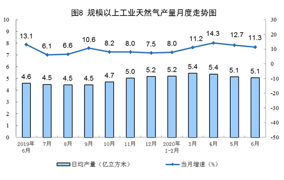 天然氣生產保持較快增長。6月份,生產天然氣152億立方米,同比增長11.3%,增速比上月回落1.4個百分點,日均產量5.1億立方米。上半年,生產天然氣940億立方米,同比增長10.3%,比一季度加快1.2個百分點。