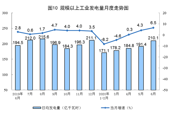電力生產繼續加快。6月份,發電量6304億千瓦時,同比增長6.5%,增速比上月加快2.2個百分點;日均發電量210.1億千瓦時,環比增加18.7億千瓦時。上半年,發電量33645億千瓦時,同比下降1.4%,降幅比一季度收窄5.4個百分點。