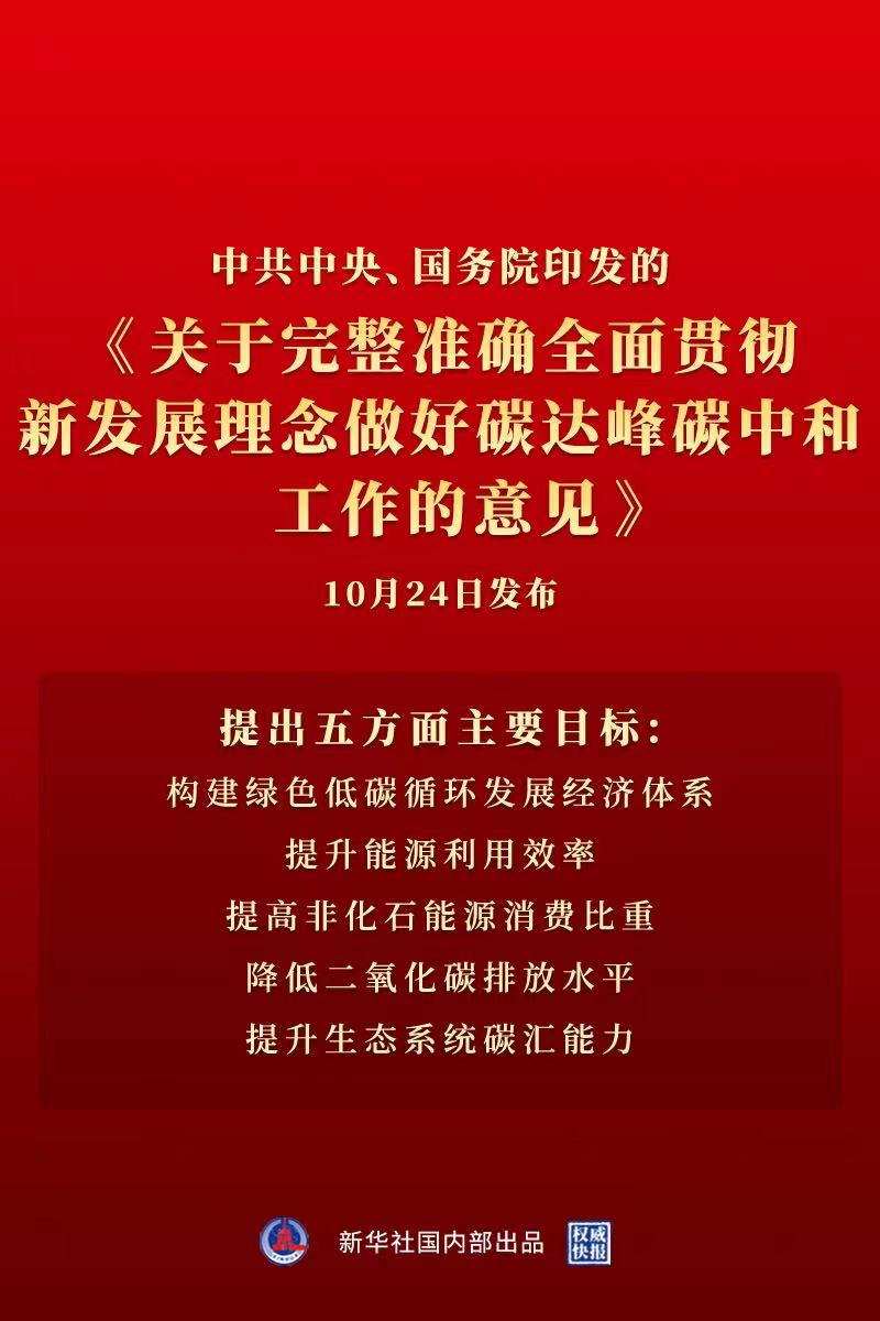 10月24日,中共中央 國務院正式發布《關于完整準確全面貫徹新發展理念做好碳達峰碳中和工作的意見》,內容極其豐富。文件強調: