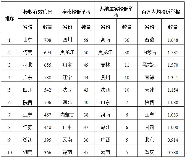 各省(自治區(qū)、直轄市)按照接收的有效信息數(shù)量排序,山東、河南、河北、廣東、四川、陜西、遼寧、江蘇、浙江、湖南排在全國(guó)前10位;按照接收的投訴舉報(bào)數(shù)量排序,四川、黑龍江、山東、遼寧、陜西、河北、內(nèi)蒙古、廣東、云南、湖南排在全國(guó)前10位;按照辦結(jié)屬實(shí)的投訴舉報(bào)數(shù)量排序,湖南、黑龍江、吉林、貴州、陜西、山東、河南、湖北、廣西、云南排在全國(guó)前10位;按照百萬(wàn)人均投訴舉報(bào)數(shù)量排序,西藏、內(nèi)蒙古、黑龍江、青海、天津、陜西、遼寧、甘肅、北京、重慶排在全國(guó)前10位。(2022年4月有效信息及投訴舉報(bào)排名前10位情況見表三)