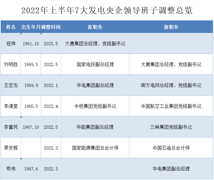2022年上半年7大發電央企領導層人事變動