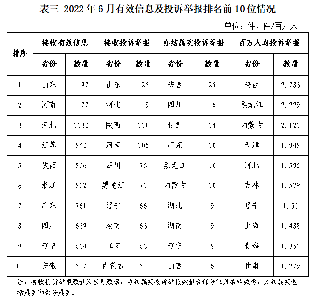 各省(自治區、直轄市)按照接收的有效信息數量排序,山東、河南、河北、江蘇、陜西、浙江、廣東、四川、遼寧、安徽排在全國前10位;按照接收的投訴舉報數量排序,山東、河北、陜西、河南、四川、黑龍江、遼寧、湖南、江蘇、內蒙古排在全國前10位;按照辦結屬實的投訴舉報數量排序,陜西、四川、甘肅、廣東、黑龍江、內蒙古、湖北、湖南、遼寧、山西排在全國前10位;按照百萬人均投訴舉報數量排序,陜西、黑龍江、內蒙古、天津、河北、吉林、遼寧、上海、青海、甘肅排在全國前10位。(2022年6月有效信息及投訴舉報排名前10位情況見表三)