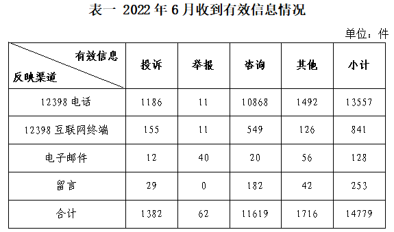 2022年6月,國家能源局12398能源監管熱線(以下簡稱12398熱線)共收到有效信息14779件(包含投訴、舉報、咨詢和其他訴求類別),環比增加43.12%,同比增加49.28%。(2022年6月收到有效信息情況見表一)