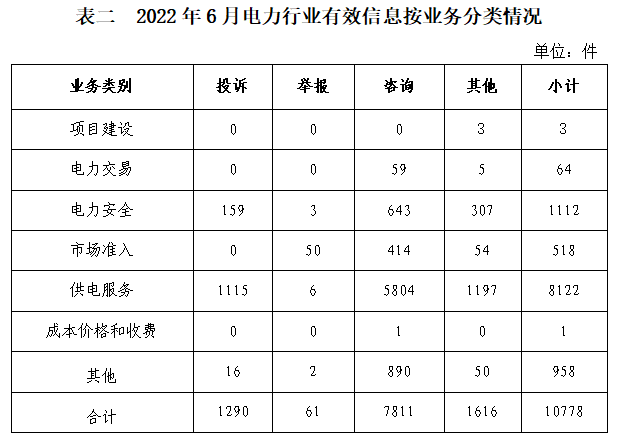 電力行業排在首位,有效信息數量為10778件,占全部有效信息的72.93%。群眾關注的內容主要集中在供電服務、停電搶修、用戶受電工程市場秩序等方面。(2022年6月電力行業有效信息按業務分類情況見表二)