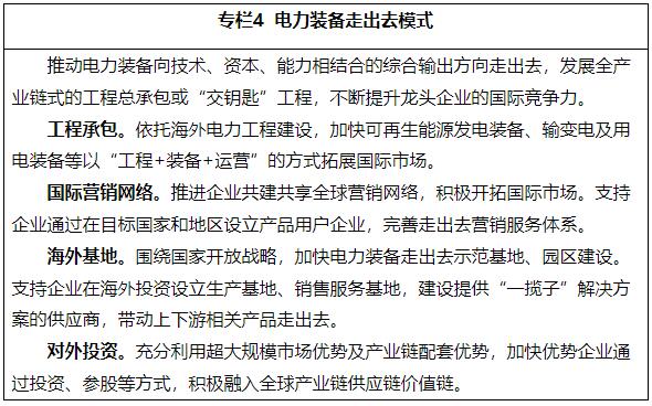 16.推動電力裝備走出去。緊緊圍繞高質量共建“一帶一路”、深入實施《區域全面經濟伙伴關系協定》,鼓勵優勢電力裝備企業以多種方式加快走出去。引導企業取得國際認可的服務資質,帶動技術、裝備、標準和服務走出去。支持行業組織搭建走出去信息綜合服務平臺,提供法律、咨詢、風險評估等服務。