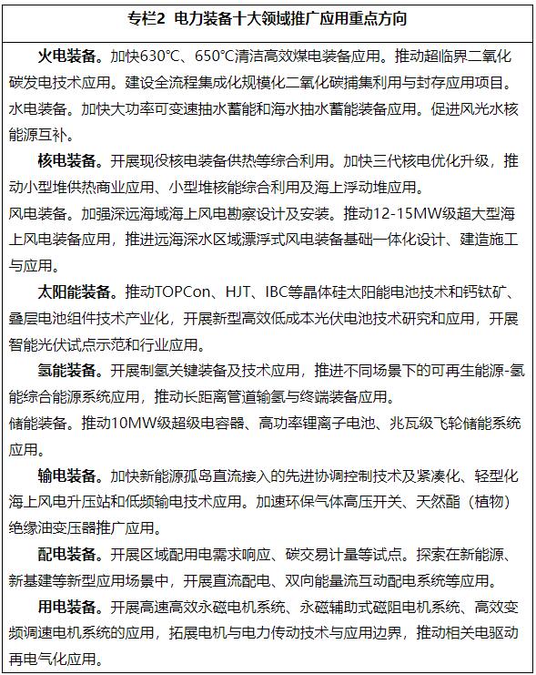 13.強化推廣應用政策引導。支持將符合條件的電力裝備納入國家、地方相關重大技術裝備指導目錄,研究發布重大技術裝備推廣應用導向目錄。利用首臺(套)重大技術裝備保險補償機制試點、能源領域首臺(套)評定和評價、綠色采購等政策。引導行業組織、研究機構等搭建供需對接平臺,加快電力裝備推廣應用。培育打造具有國際競爭力的“中國重裝”品牌。