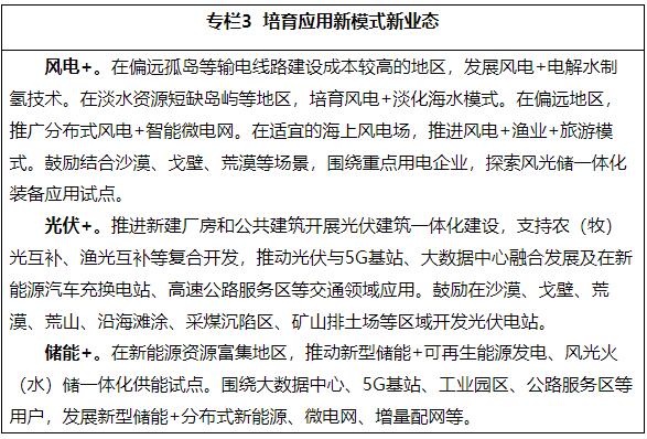 15.培育推廣應用新模式新業態。推進源網荷儲一體化和多能互補,培育風電+、光伏+等多種應用新模式新業態,加快多層級多時間尺度多能互補協同優化。