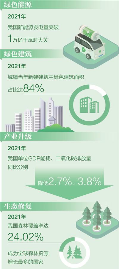 推進建筑、交通等領域低碳轉型。積極發展綠色建筑,推進既有建筑綠色低碳改造,2021年全國城鎮新建綠色建筑面積達到20多億平方米。加大力度推廣節能低碳交通工具,新能源汽車產銷量連續7年位居世界第一,保有量占全球一半。