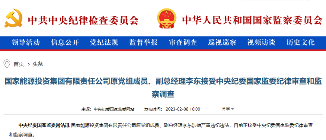 2月8日,據中央紀委國家監委網站消息,國家能源投資集團有限責任公司原黨組成員、副總經理李東涉嫌嚴重違紀違法,目前正接受中央紀委國家監委紀律審查和監察調查。