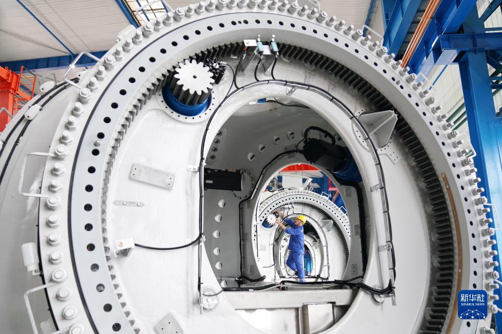 在黑龍江省齊齊哈爾市中國一重集團有限公司風電裝備生產制造廠生產車間,工人進行生產作業(2021年7月1日攝)。