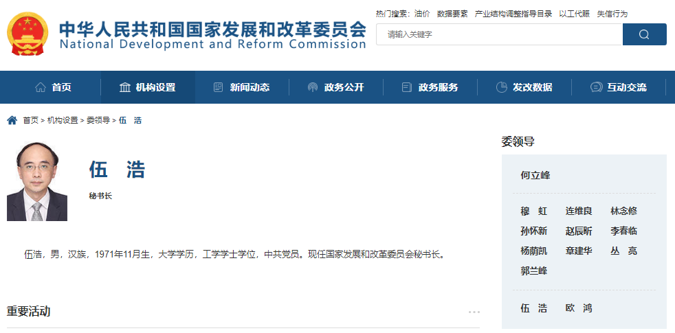 據國家發改委官方網站“委領導”欄目最新名單顯示,伍浩已任國家發改委秘書長。
