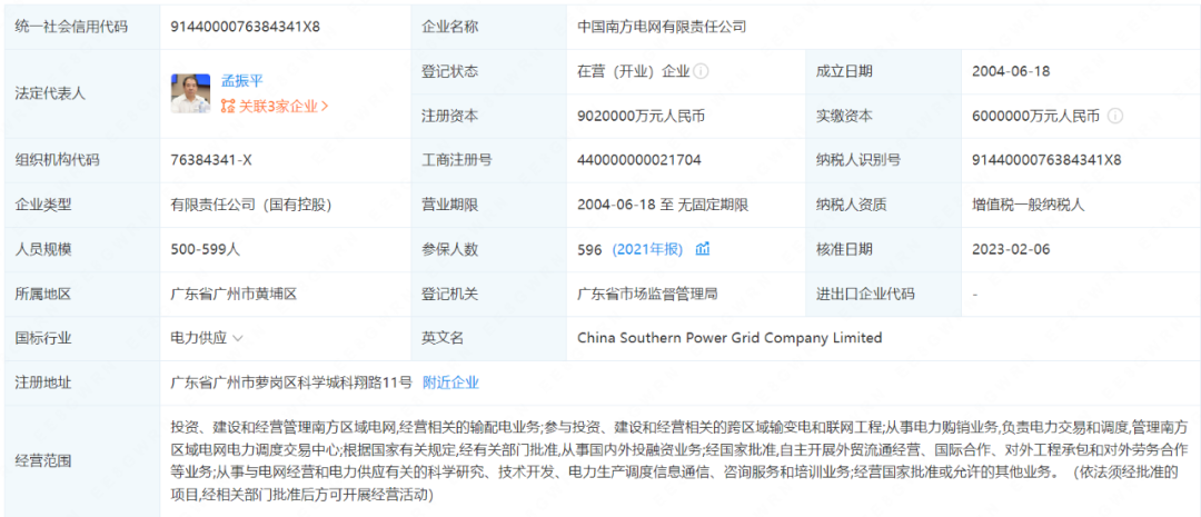 2月6日,中國南方電網有限責任公司發生工商變更。