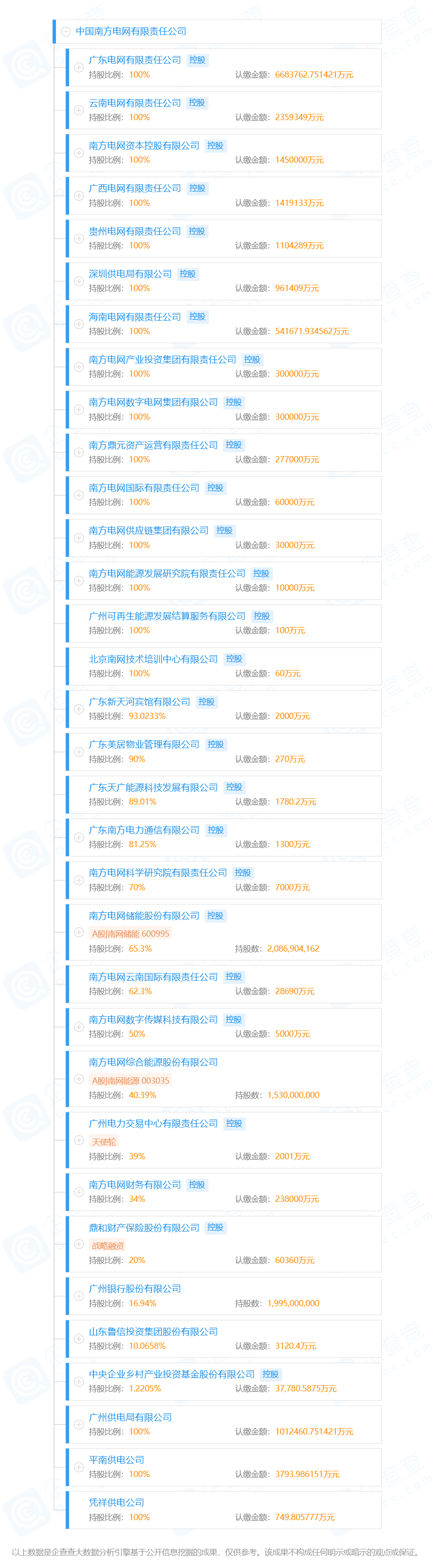 南方電網對外投資控股33家企業,如下圖所示。
