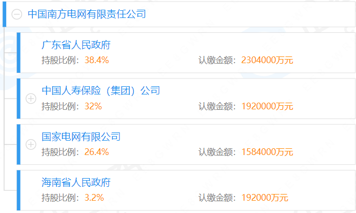 此時南方電網的股權結構為:廣東和海南省政府分別以本省電網資產作為出資;國家電網公司則以云南、貴州、廣西三省(區)電網資產出資,共同組建了南方電網公司。當時的股權結構為廣東省國資委持股70.4%,國家電網公司持股26.4%,海南省政府持股3.2%。