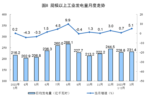 電力生產(chǎn)增速加快。3月份,發(fā)電7173億千瓦時(shí),同比增長(zhǎng)5.1%,增速比1—2月份加快4.4個(gè)百分點(diǎn),日均發(fā)電231.4億千瓦時(shí)。1—3月份,發(fā)電20712億千瓦時(shí),同比增長(zhǎng)2.4%。