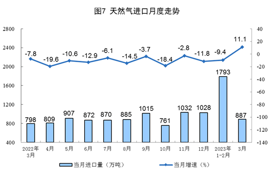 1—3月份,生產(chǎn)天然氣595億立方米,同比增長(zhǎng)4.5%。進(jìn)口天然氣2675萬噸,同比下降3.6%。