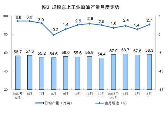 原油生產(chǎn)有所加快,進口由降轉(zhuǎn)增。5月份,生產(chǎn)原油1807萬噸,同比增長2.7%,增速比4月份加快1.3個百分點,日均產(chǎn)量58.3萬噸。進口原油5144萬噸,同比增長12.3%,4月份為下降1.4%。