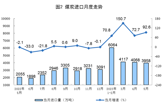 原煤生產(chǎn)保持穩(wěn)定,進口持續(xù)高位增長。5月份,生產(chǎn)原煤3.9億噸,同比增長4.2%,增速比4月份放緩0.3個百分點,日均產(chǎn)量1243萬噸。進口煤炭3958萬噸,同比增長92.6%,增速比4月份加快19.9個百分點。