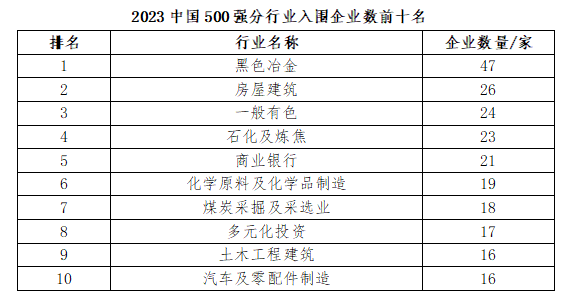 2023中國企業500強中,制造業264家;服務業164家;其他行業72家。產業結構繼續優化,電力電氣設備制造、通信設備制造業等行業入圍企業數量增加;黑色冶金、房屋建筑、住宅地產等行業入圍企業數量減少。