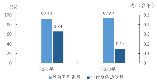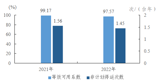 10萬千瓦及以上燃氣-蒸汽聯合循環機組等效可用系數92.62%,同比增加0.19個百分點;非計劃停運0.15次/臺年,同比下降0.18次/臺年。