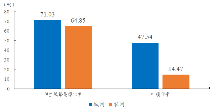2022年,納入電力可靠性統計的10千伏用戶1241.01萬戶,用戶總容量58.90億千伏安。城網、農網架空線路絕緣化率分別為71.03%、64.85%,城網、農網電纜化率分別為47.54%、14.47%。