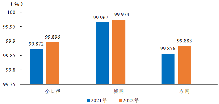 2022年,全國用戶平均供電可靠率99.896%,同比上升0.025個百分點,其中,城網99.974%,農網99.883%。城網與農網相差0.091個百分點。