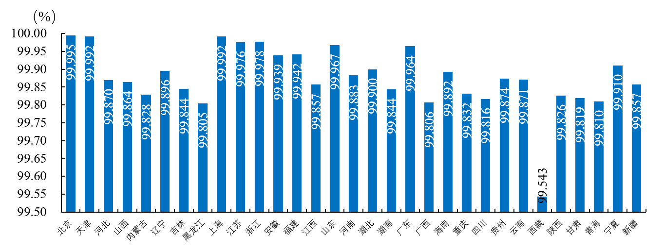 2022年,全國31個省級行政區中,北京、天津、上海、浙江、江蘇、廣東、山東的用戶平均供電可靠率高于99.95%,西藏的用戶平均供電可靠率低于99.80%。