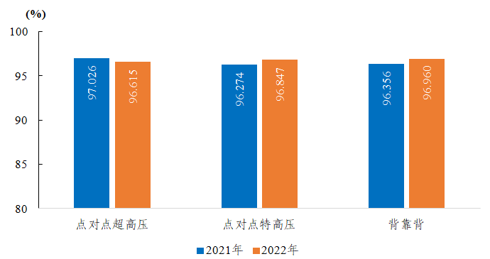 2022年,納入電力可靠性統計的點對點超高壓直流輸電系統能量可用率為96.615%,同比下降0.411個百分點;點對點特高壓直流輸電系統能量可用率為96.847%,同比上升0.573個百分點;背靠背直流輸電系統能量可用率為96.960%,同比上升0.604個百分點。