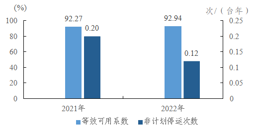2022年輸變電設施運行可靠性指標總體位置在較高水平,十三類輸變電設施的可用系數保持在99.45%以上,強迫停運率維持在0.3次/百千米(臺、套、段)年以下。